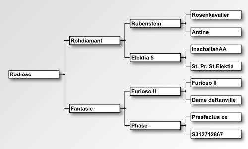 Foaled in Germany (1996-2022 ) and bred by Heinrich Lahmeyer, Rodioso stood 16.1 and had lovely fluid gaits. He was approved by the GOV in 1999 and achieved scores of '10' on character, '9' on conformation and '8' on temperament and ridability. He had a superb show record both in hand, being named Grand Champion Stallion at The Devon Horse Show in 2001 and showing thru Grand Prix Dressage. He earned 3 USDF Bronze Medals and 2 USDF Silver Medals for Derby Farms' students and achieved the Gold Medal scores for his owner, Pamela Pentz.